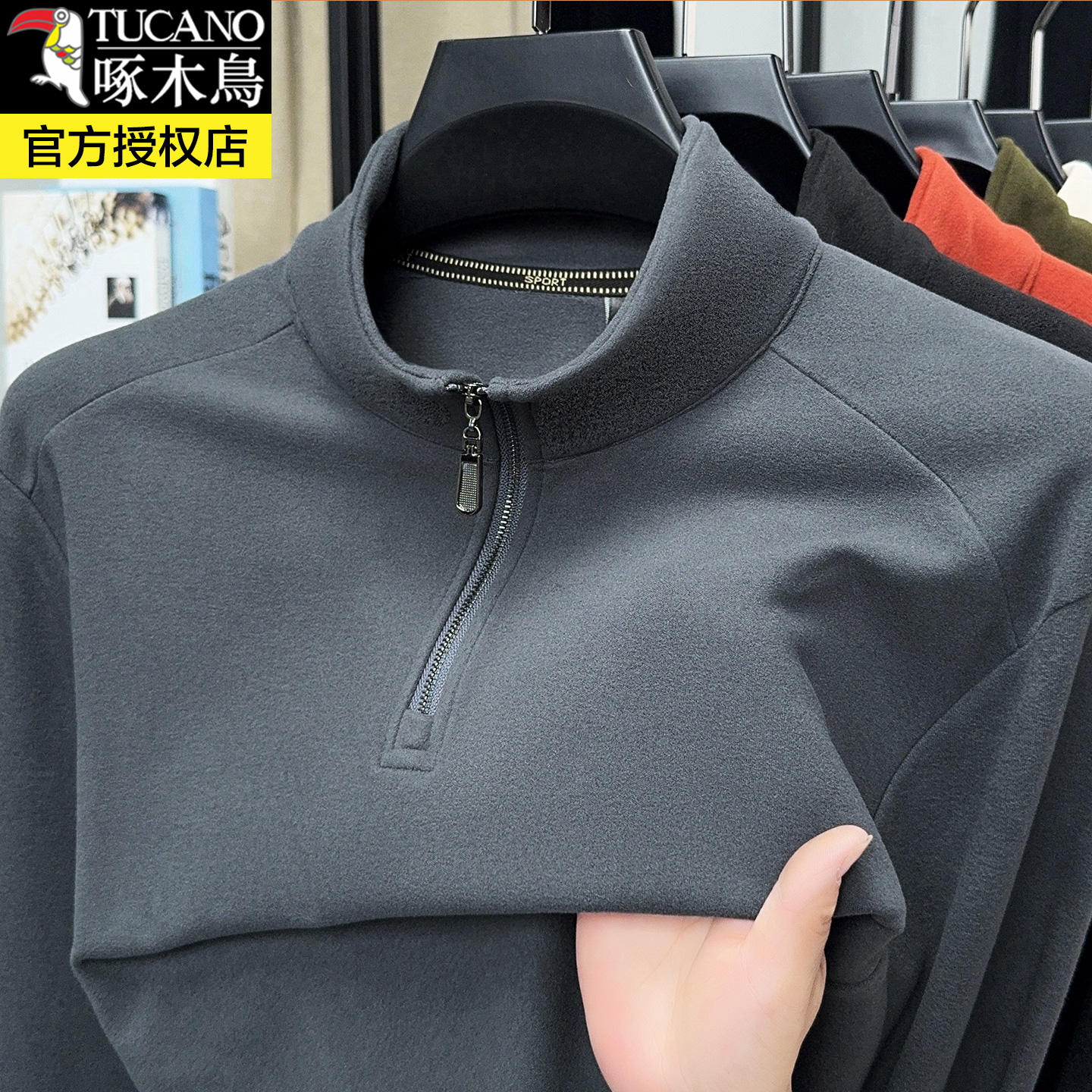 啄木鸟秋冬季双面德绒打底衫男半拉链立领保暖卫衣中年长袖t恤男