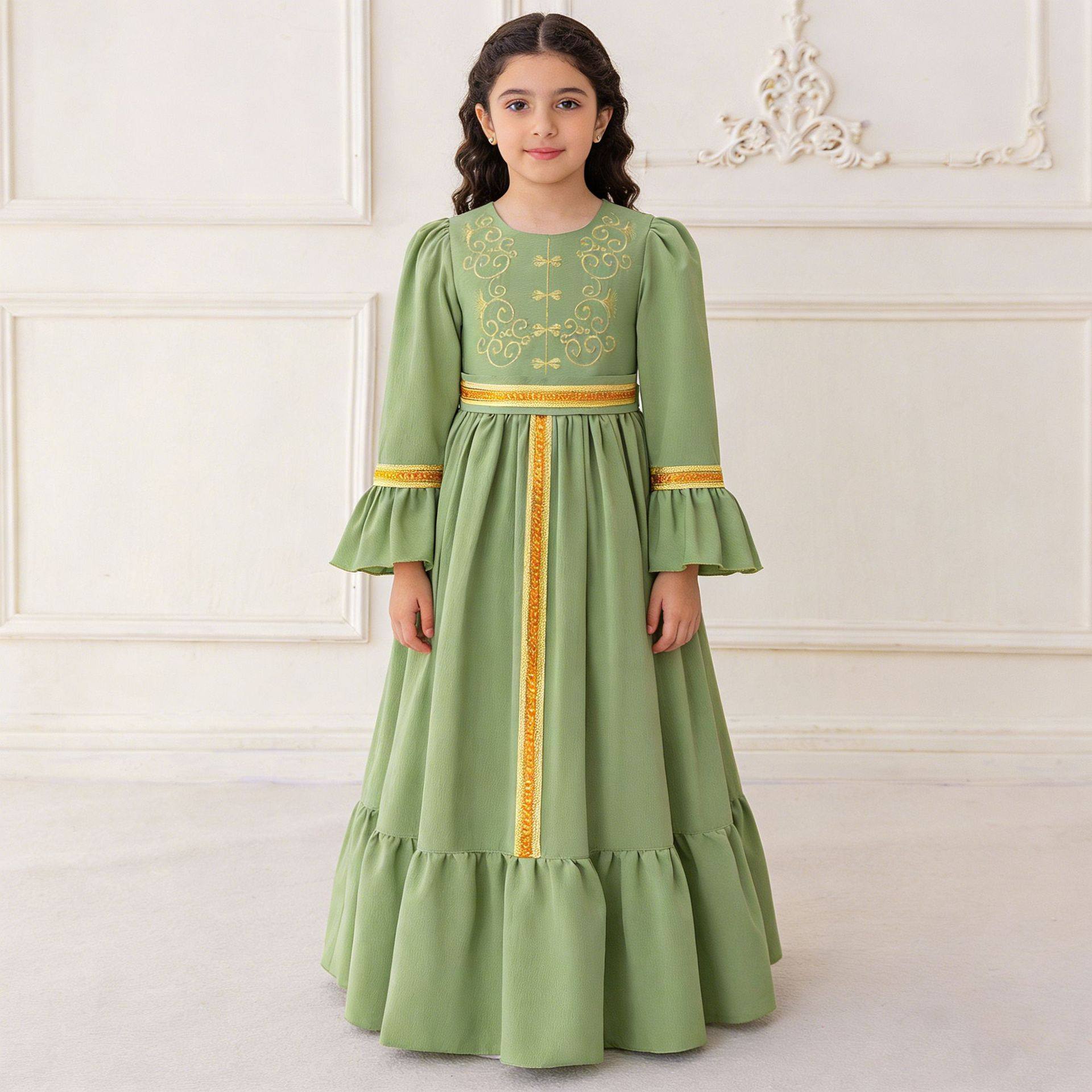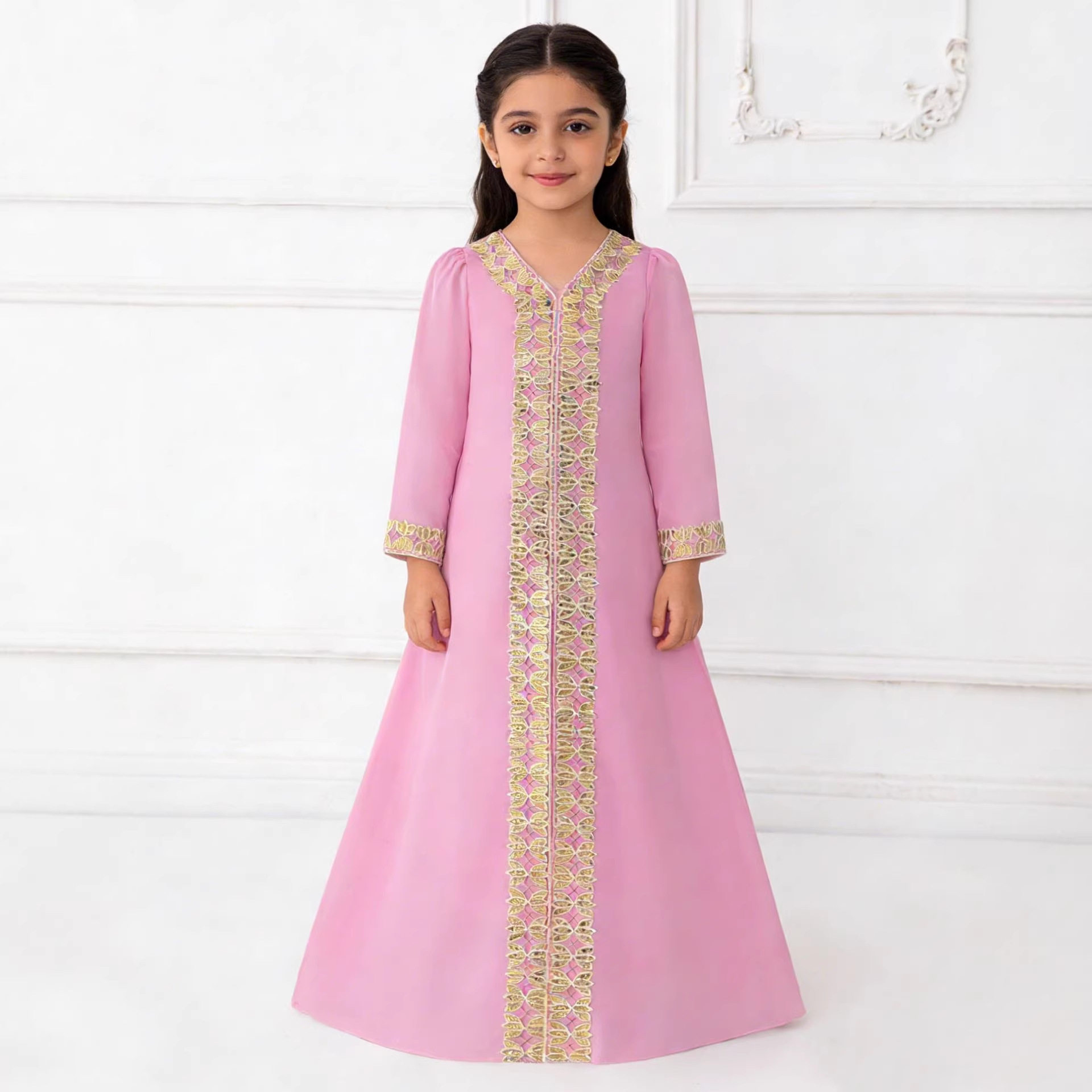 中东沙特阿拉伯迪拜儿童长袍女童长袖礼服裙女孩民族风粉色连衣裙