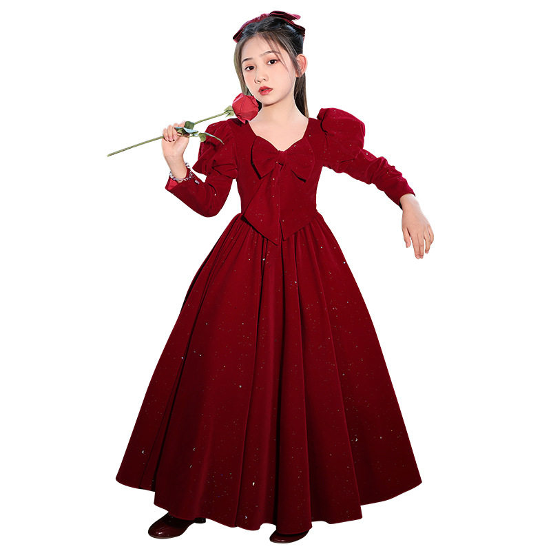 2025新款女童长袖礼服红色儿童新年公主裙主持人小花童婚礼钢