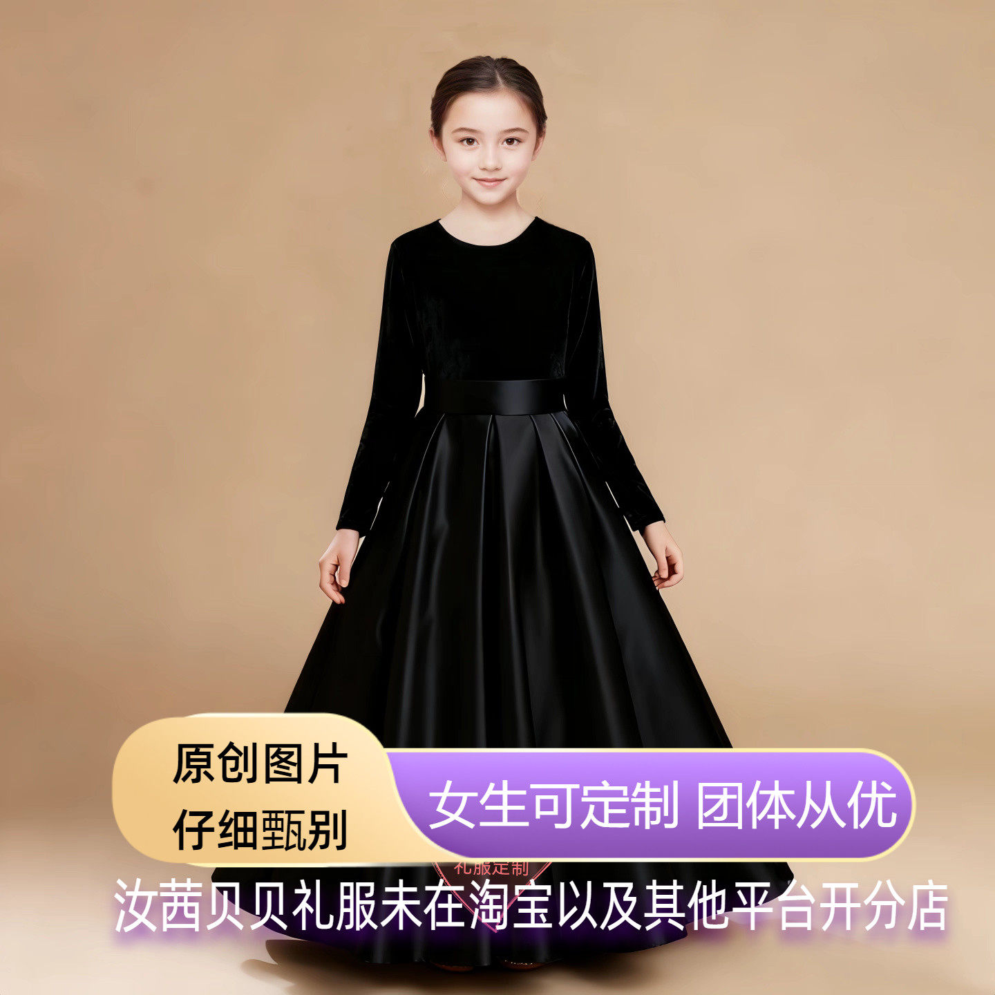 黑色女孩钢琴小提琴丝绒长袖演出服主持人女童礼服管弦乐团大合唱