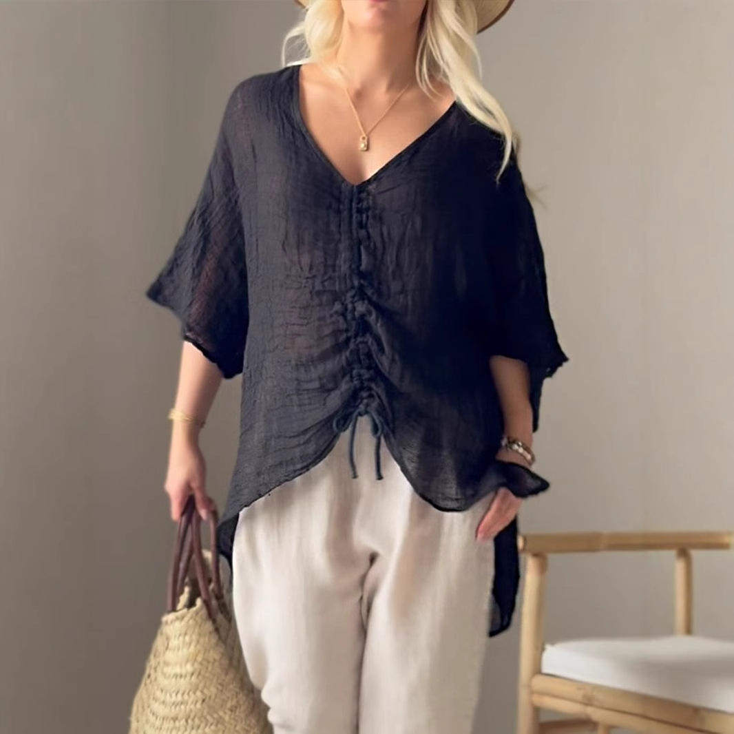 2025夏季欧美亚马逊女士纯色V领七分袖棉麻抽绳上衣衬衫喇叭袖