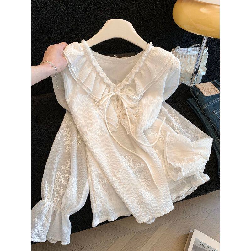 新款女士衬衫v领荷叶边喇叭袖长袖宽松刺绣雪纺高级感上衣遮肉女