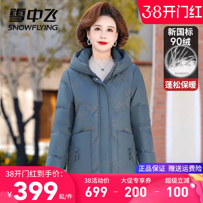 雪中飞中老年女款羽绒服中式绣花妈妈装冬季加厚大码蓝色女装外套