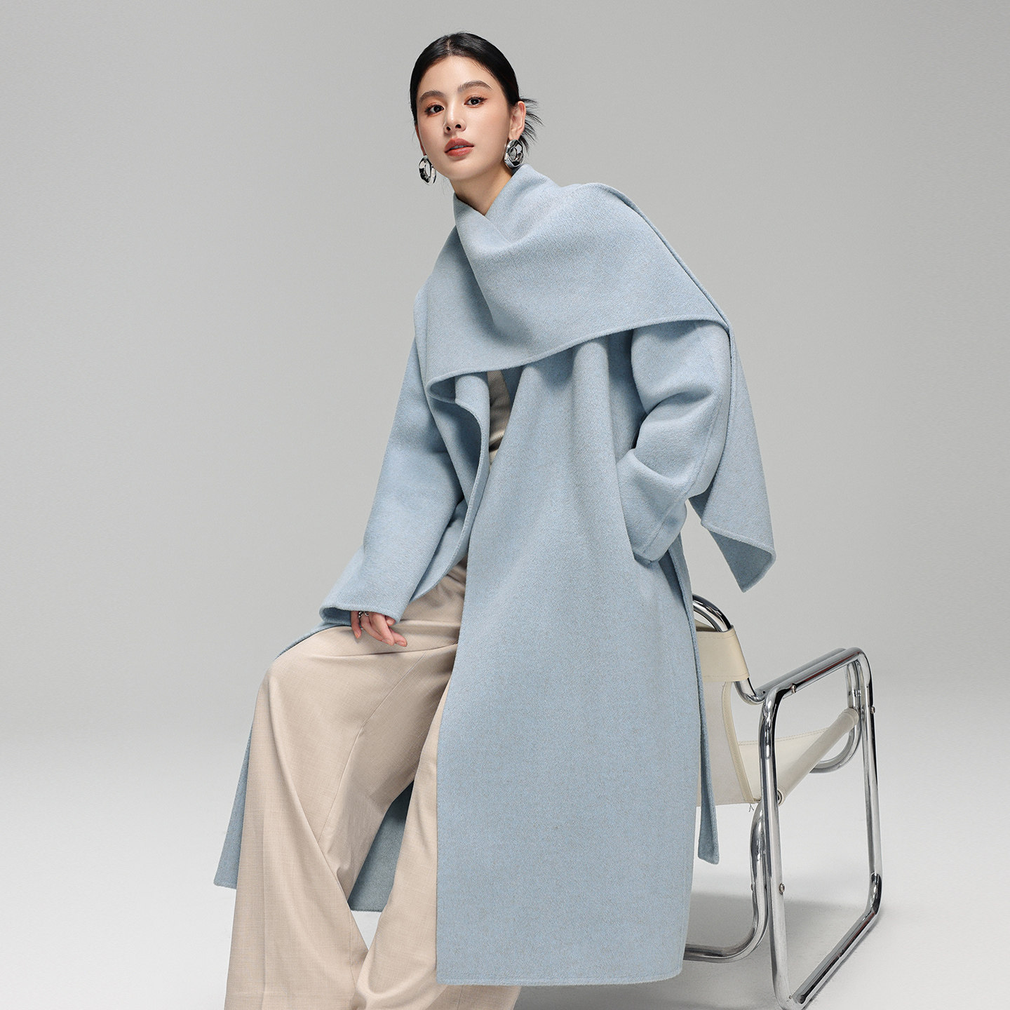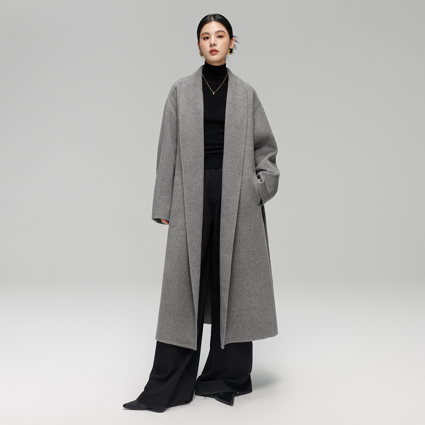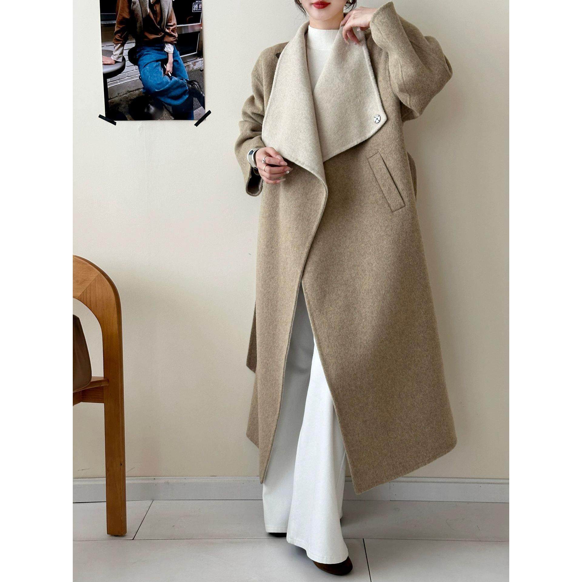 浴袍款松弛感双面羊绒大衣女长款过膝大翻领拼接羊毛呢子腰带外套