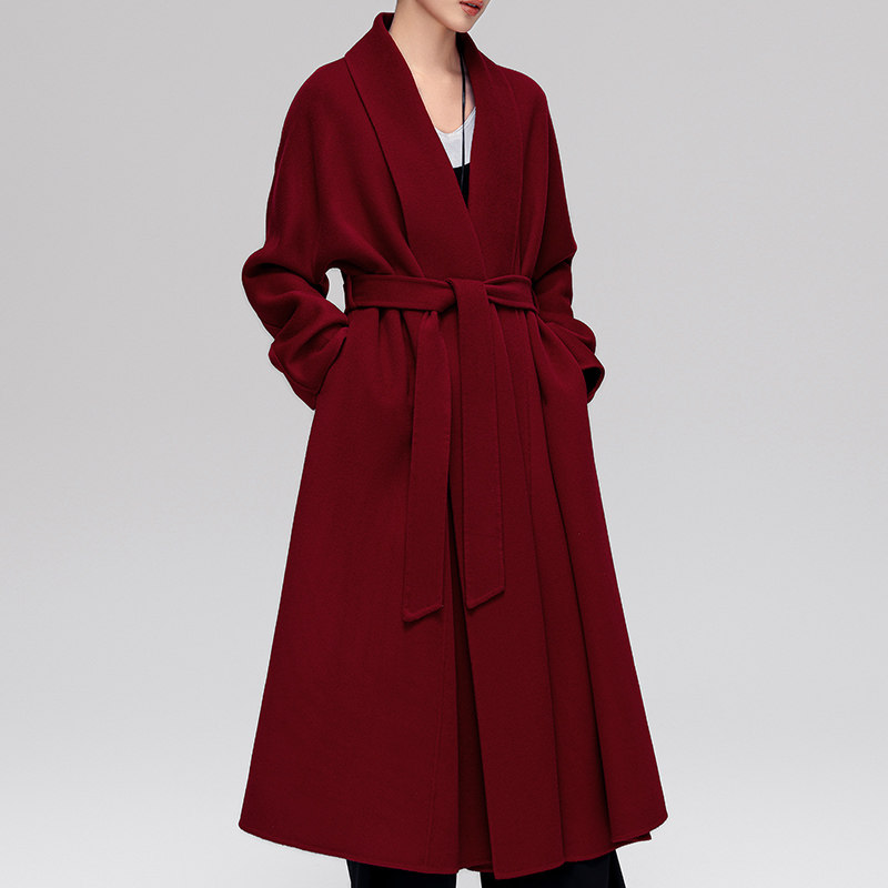 水沐飞高级感酒红色双面羊绒大翻领毛呢大衣女秋冬中长款羊毛外套