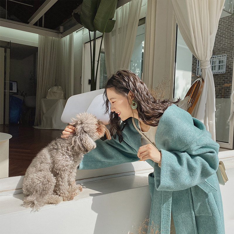 竹依依高端孔雀蓝色连帽双面羊绒大衣女长款2025冬新款羊毛呢外套