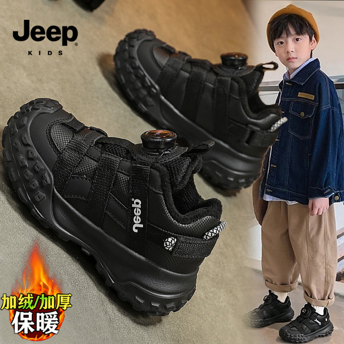 jeep男童保暖冬鞋2026新款冬季加绒加厚二棉鞋防滑防水儿童运动鞋