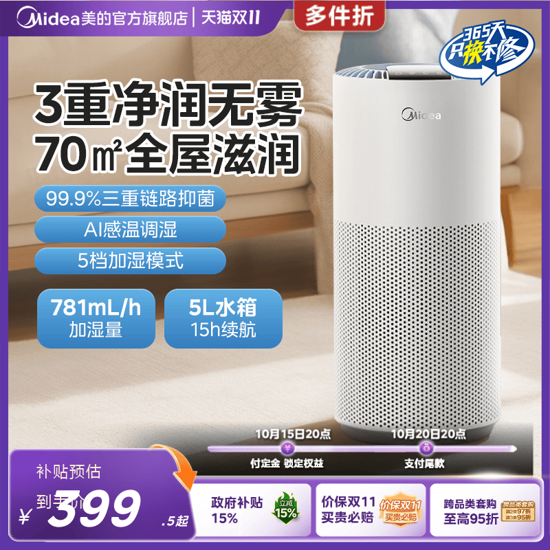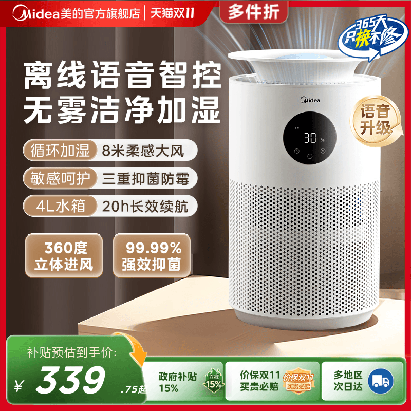 美的空气净化器家用除甲醛数显加湿净化一体机杀病菌吸烟异味粉尘