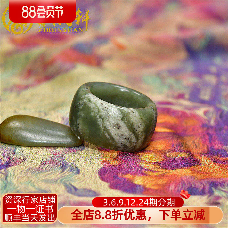 紫润轩新疆和田玉籽料扳指青玉戒指21 3MM白沁皮指环亚光男女款