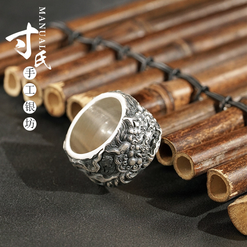S999原创手工个性复古潮流男款戒指 麒麟扳指 古法做旧云南雪花银
