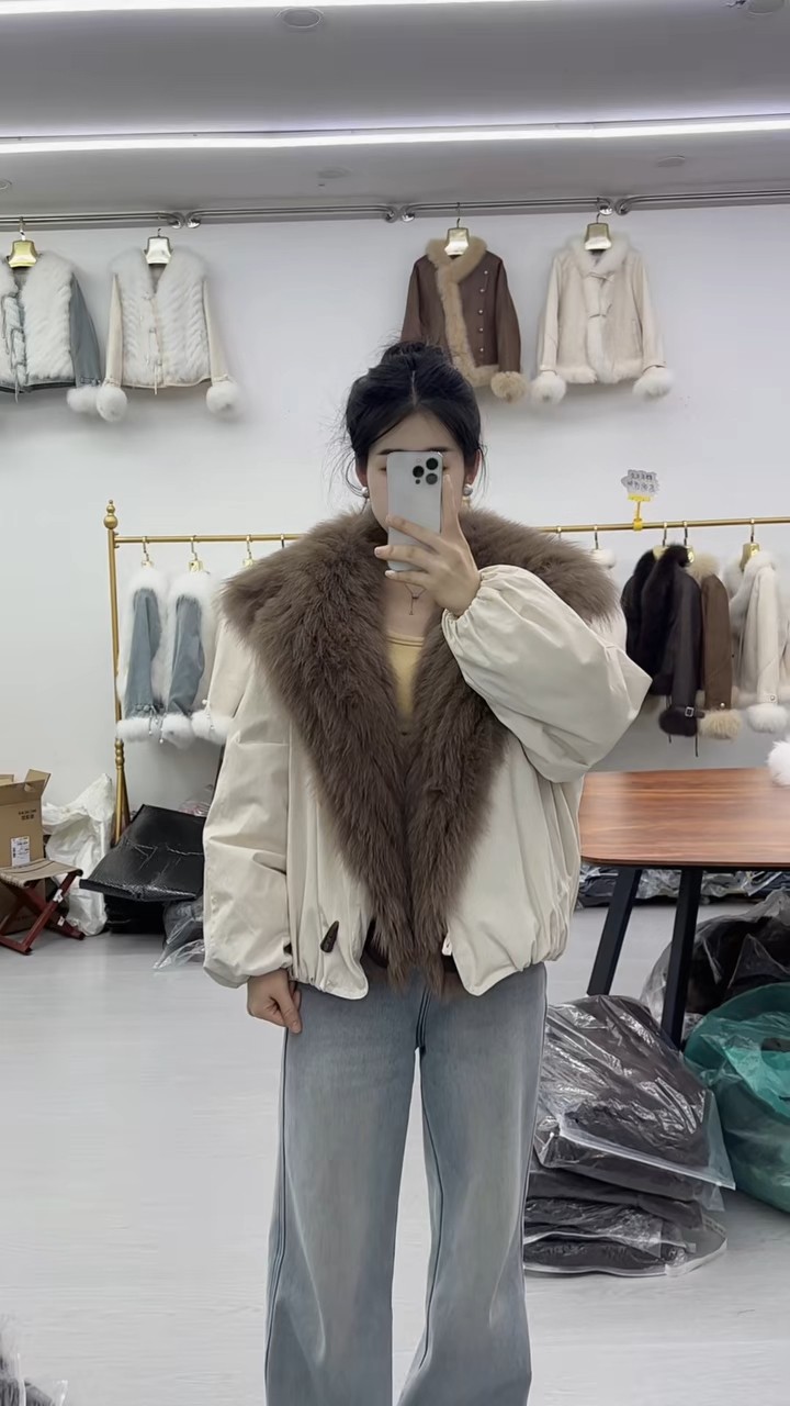 2025新款超大狐狸毛领派克服皮草鹅绒服女短款加厚保暖外套冬季