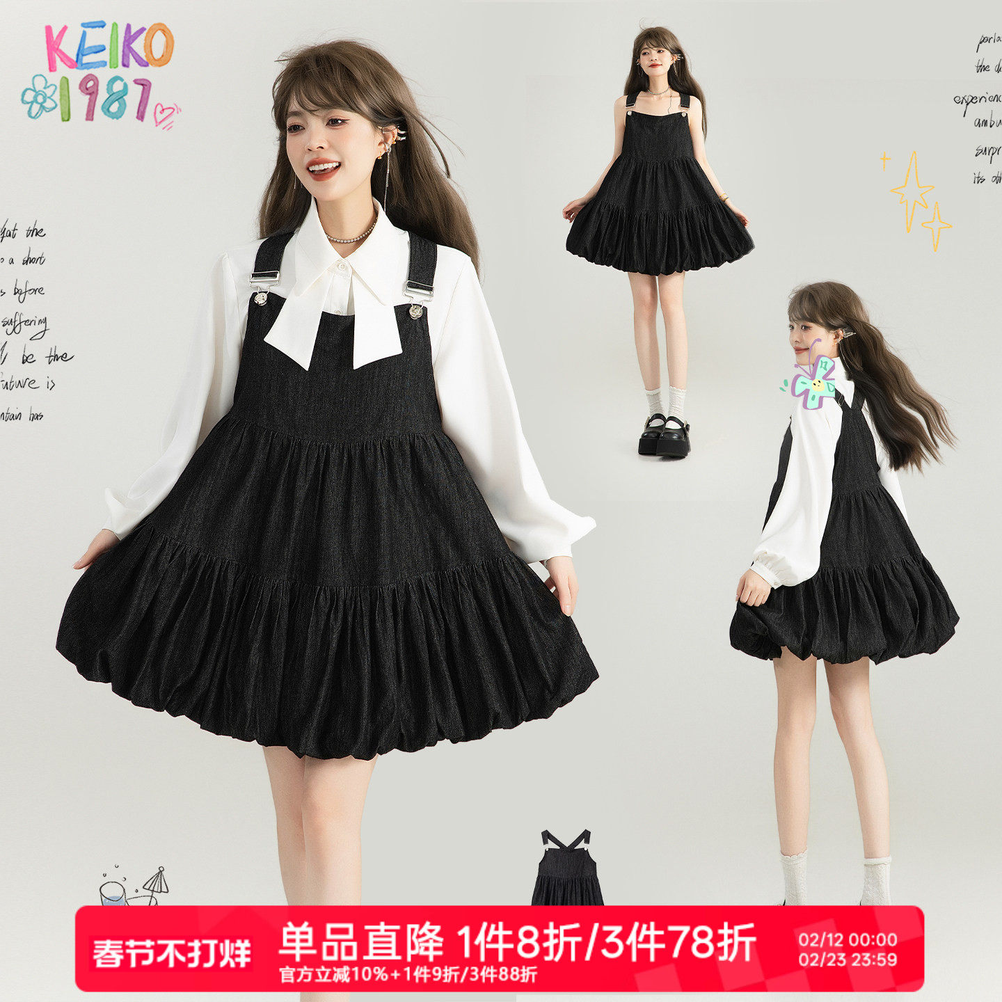 KEIKO 甜酷黑色牛仔背带连衣裙26春季复古减龄蓬蓬花苞蛋糕裙