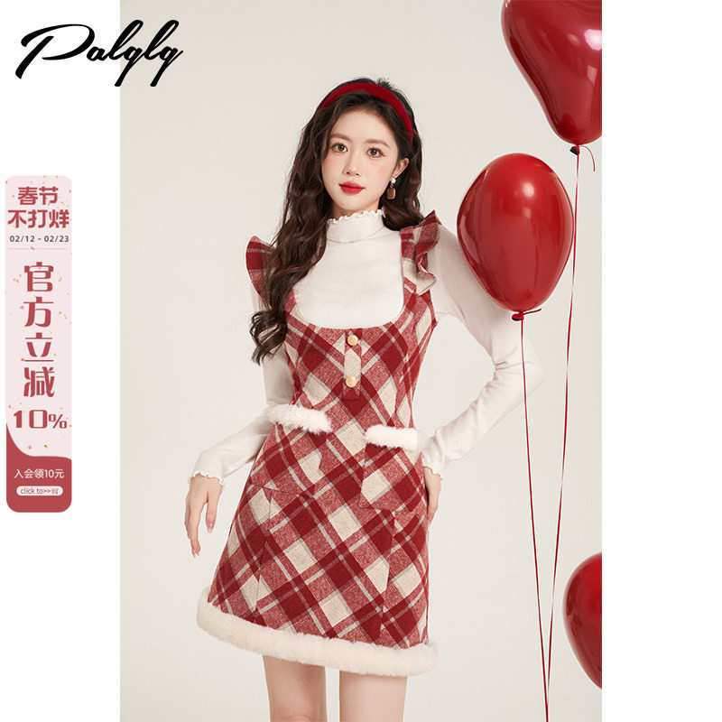 蛋包饭餐厅【草莓千层】圣诞红格子背带连衣裙女春季甜美毛呢长裙