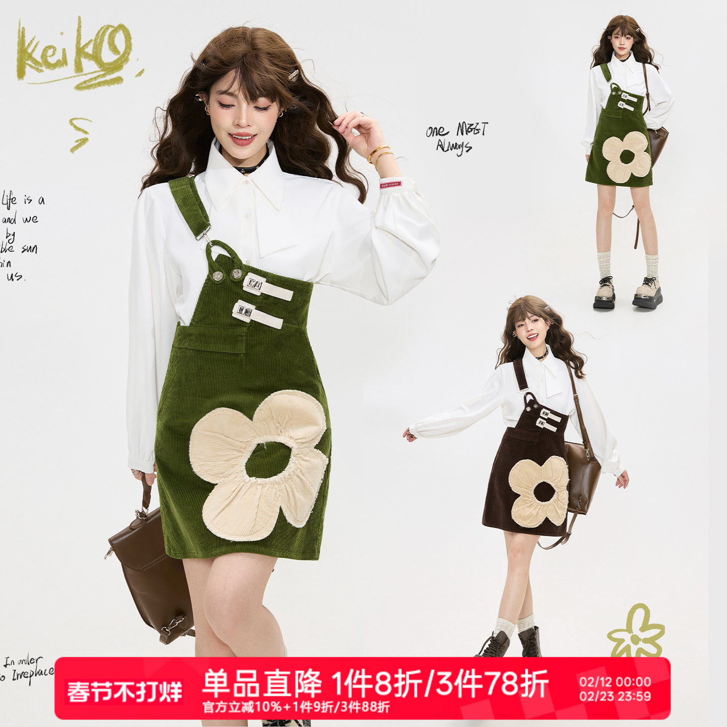 KEIKO 立体花朵饰斜肩背带连衣裙春季今年流行收腰A字半身短裙子