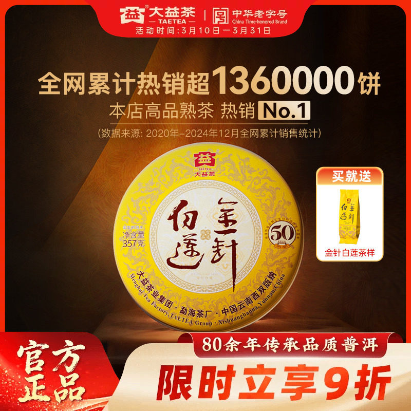 大益茶叶普洱茶金针白莲普洱熟茶357g饼茶50周年纪念版官方旗舰店