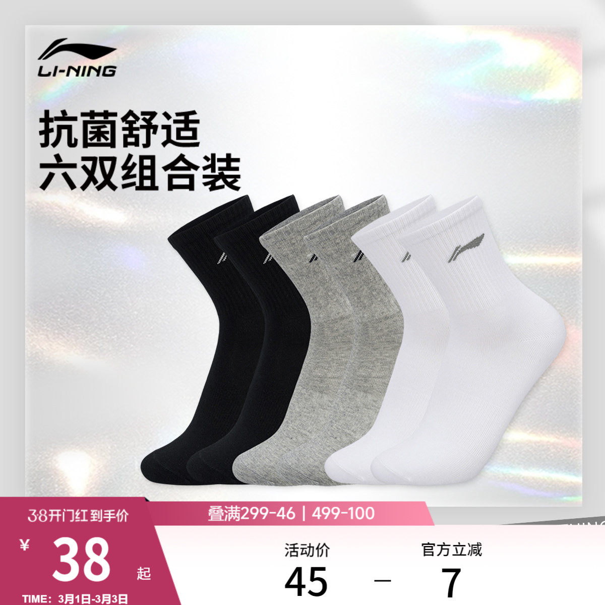 李宁袜子男春季跑步中长袜组合吸汗透气短袜运动健身舒适棉袜女款