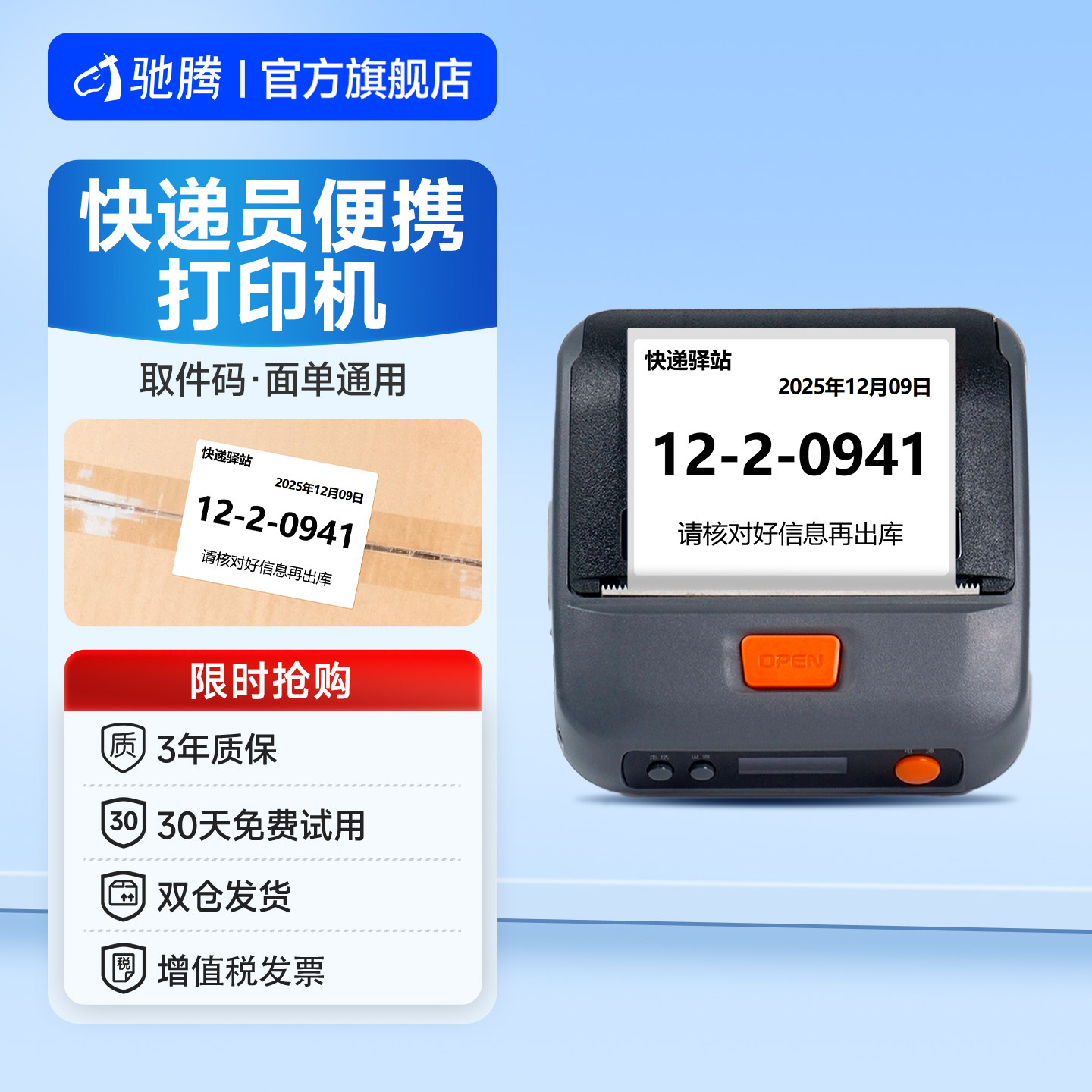 驰腾326B蓝牙快递打印机便携式电子面单快递员打单机中通圆通申通韵达百世优速安能顺丰通用取件码热敏标签