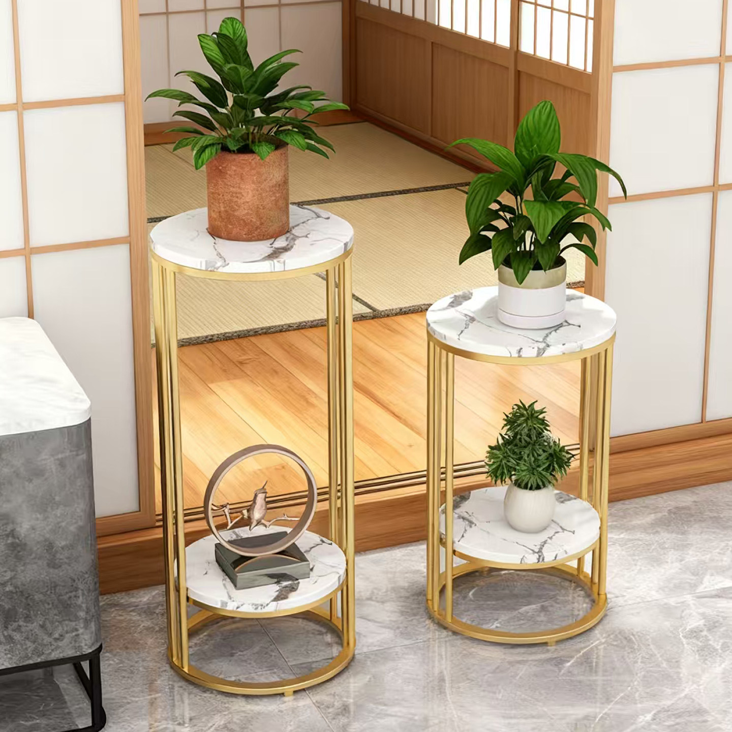 北欧轻奢岩板落地式花架铁艺置物架绿萝室内多层小阳台电视柜花架
