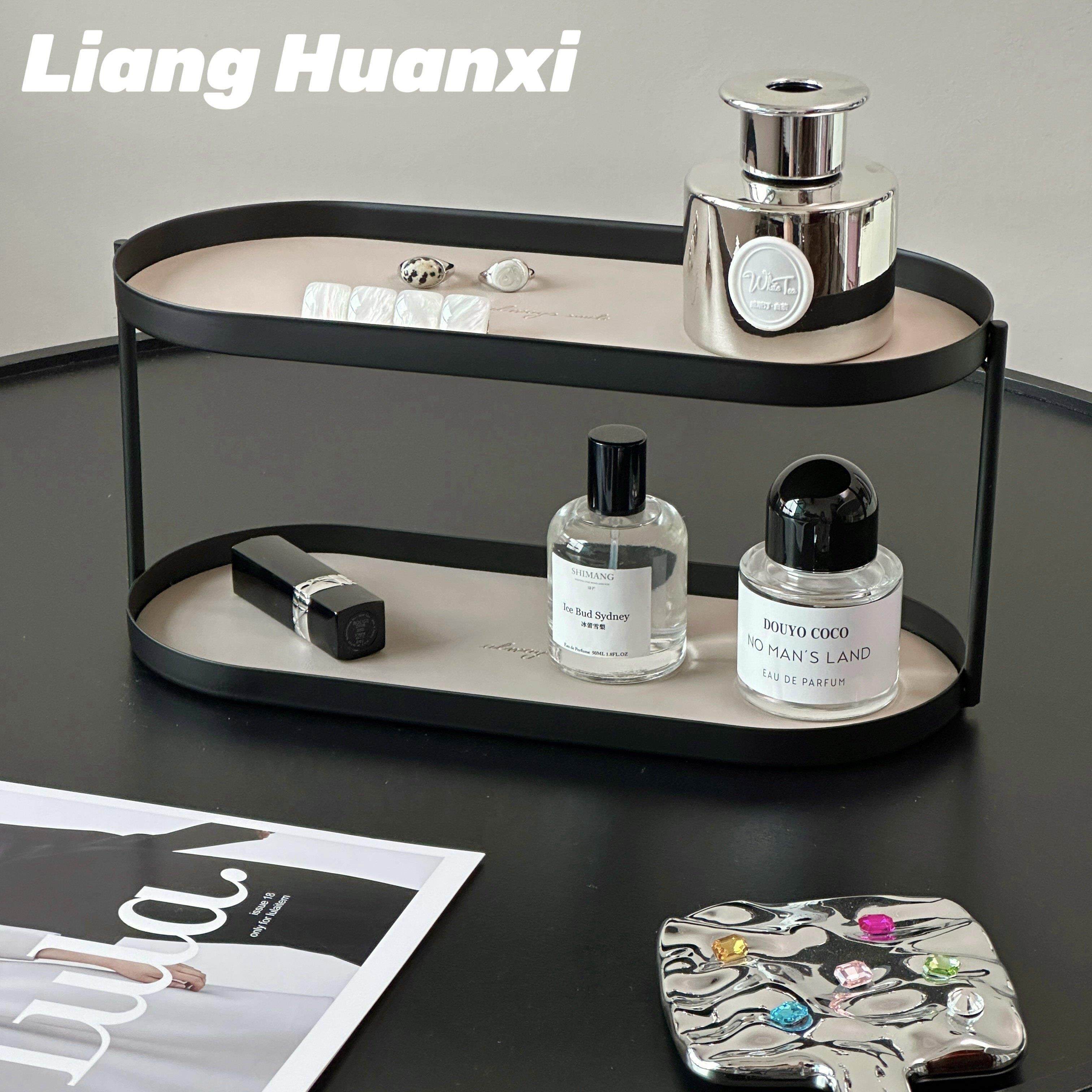轻奢烤漆铁艺置物架双层皮革化妆品收纳架首饰托盘玄关桌面收纳盒