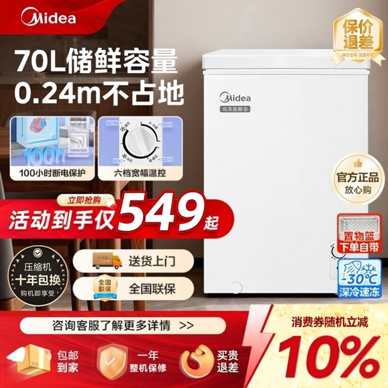 美的家用70升冰柜小型商用冷冻柜冷冻冷藏节能卧式冰箱车小载冰箱