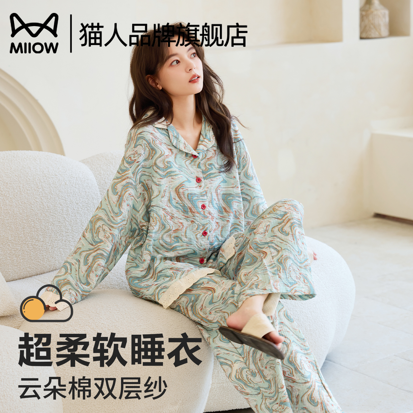 猫人云朵棉双层纱睡衣女春秋季2025秋冬新款长袖家居服套装可外穿