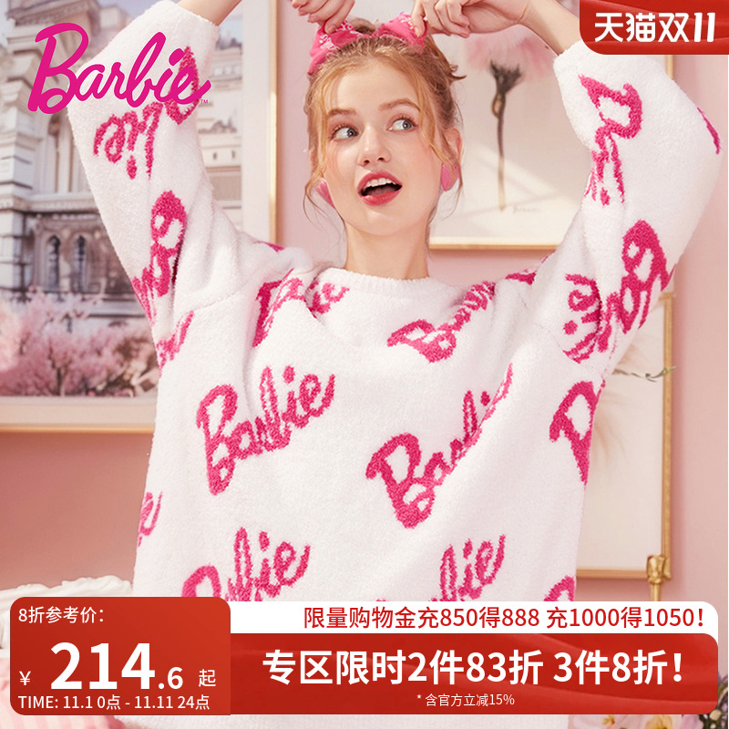 芭比X好奇蜜斯联名睡衣女冬可外穿加绒加厚半边绒珊瑚家居服套装