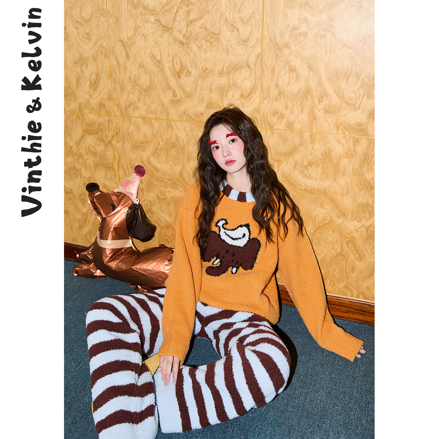 V&K2025秋冬新款女睡衣家居服小象半边绒绒套装保暖休闲复古甜心