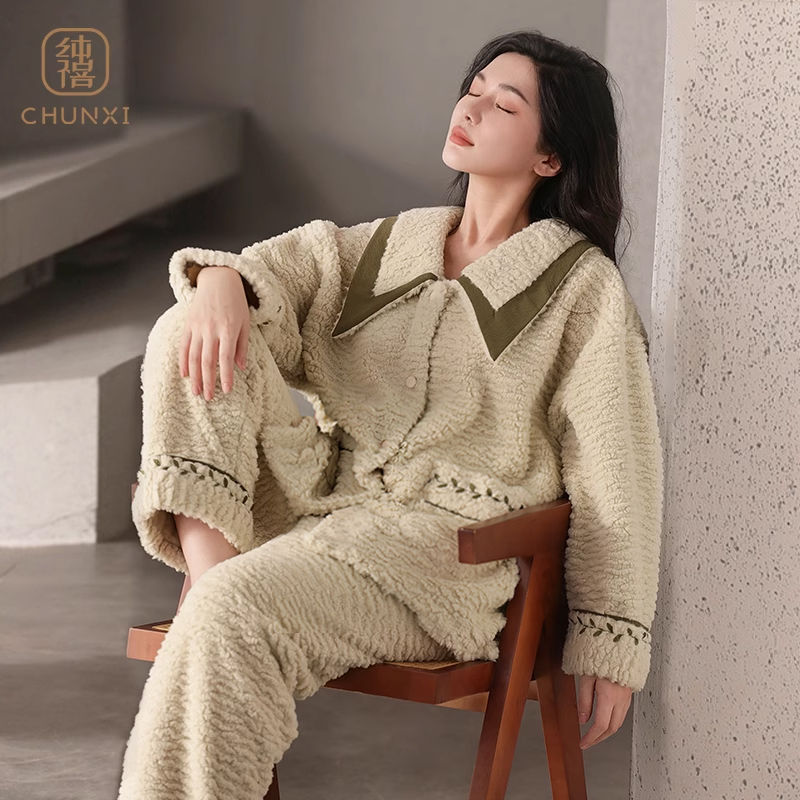 纯禧睡衣女冬季珊瑚绒家居服加厚秋冬小香风高个子大码胖mm可外穿