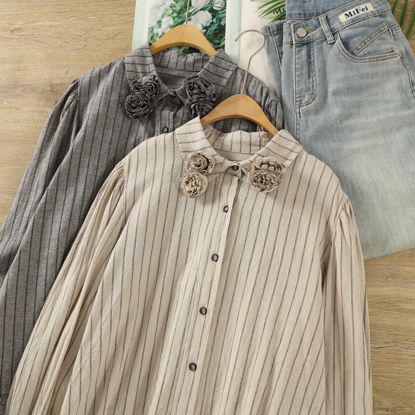 2025秋季法式设计感小众立体花朵纯棉条纹衬衫女复古文艺宽松衬衣