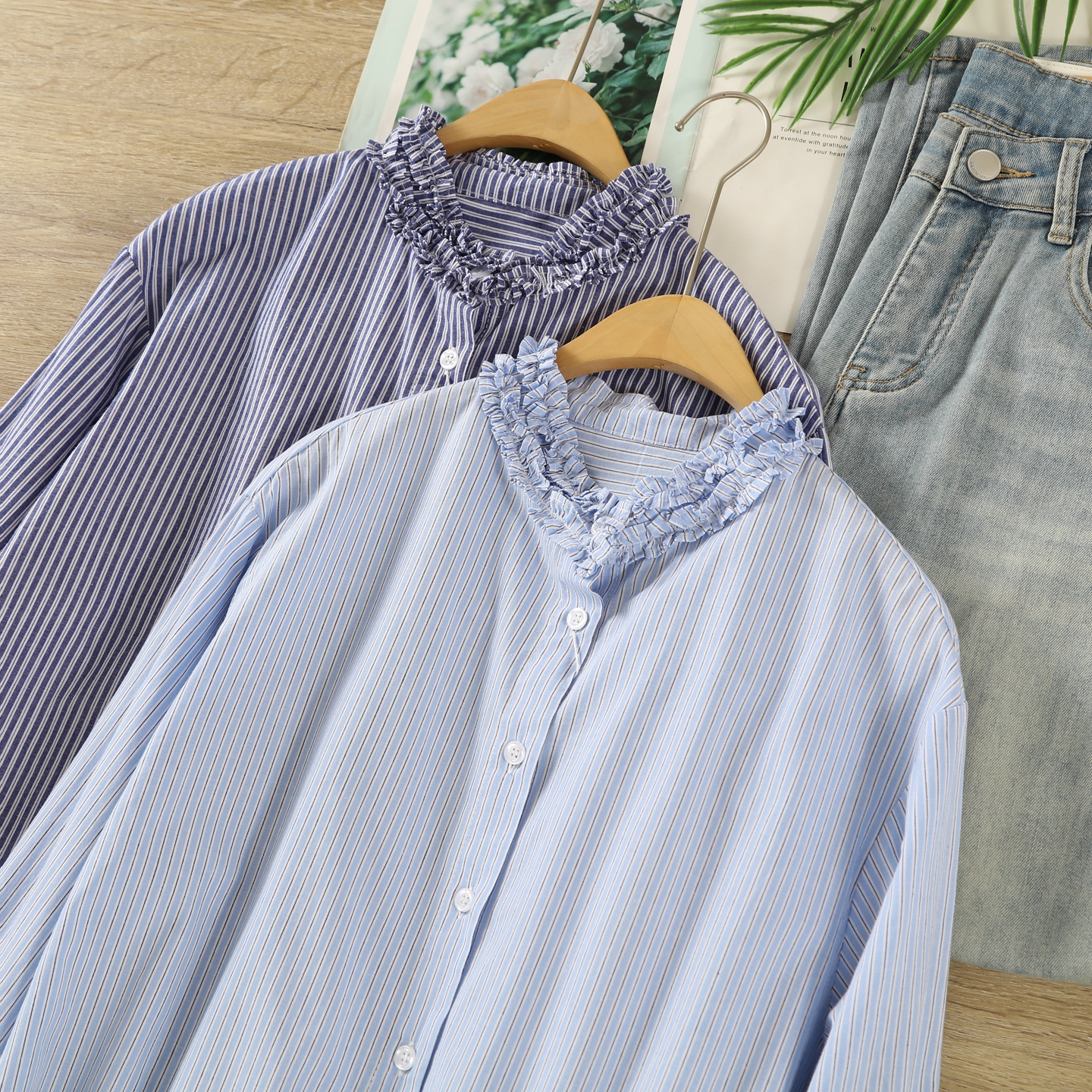 通勤文艺设计感木耳边立领纯棉条纹衬衫女秋简约百搭打底长袖衬衣