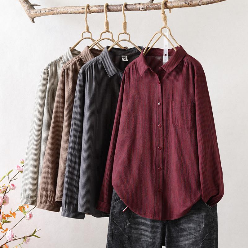 翻领纯棉条纹衬衫女长袖2025春季新款文艺学院风秋冬舒适打底衬衣
