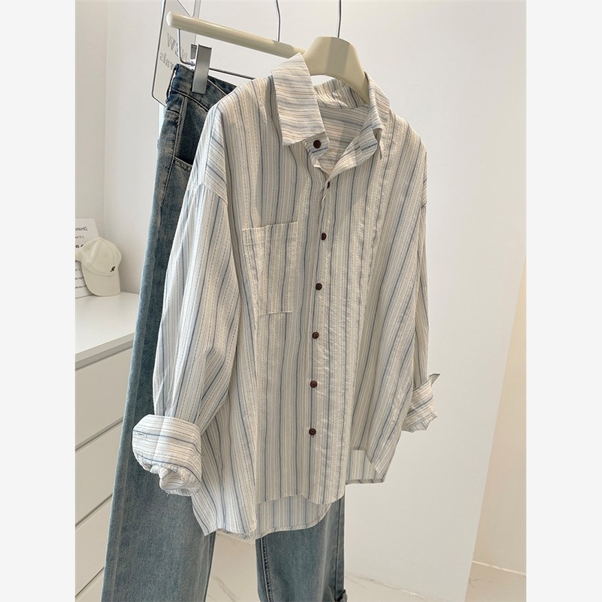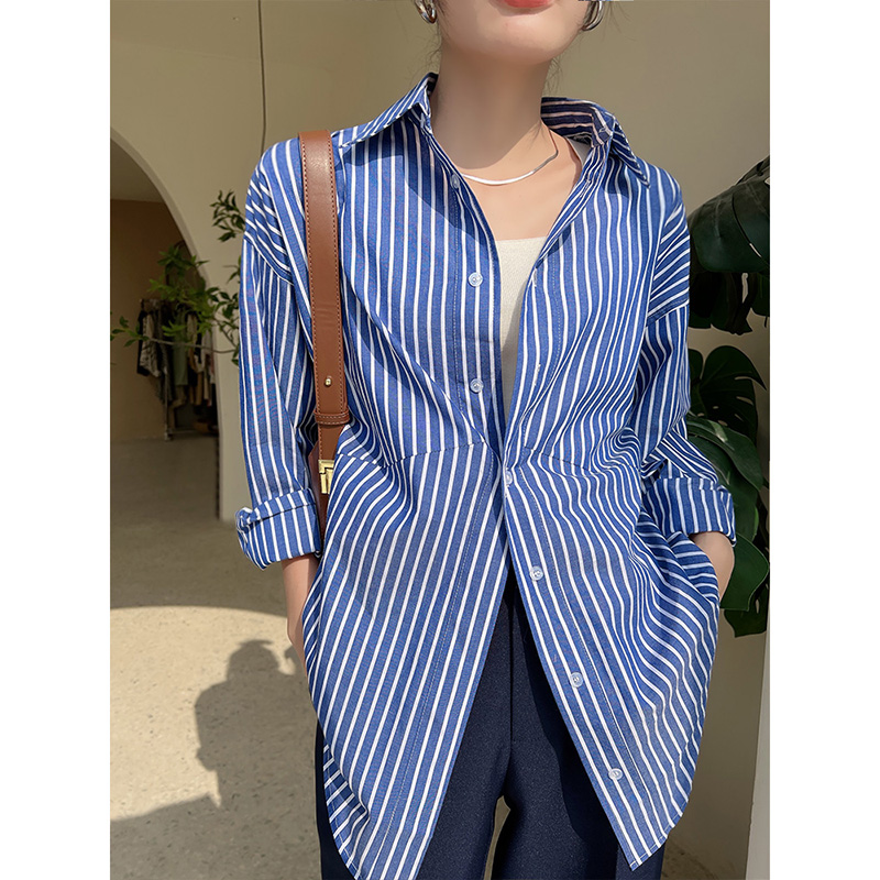 2025新款百搭显瘦纯棉条纹衬衫女设计感韩系衬衣小个子宽松外套