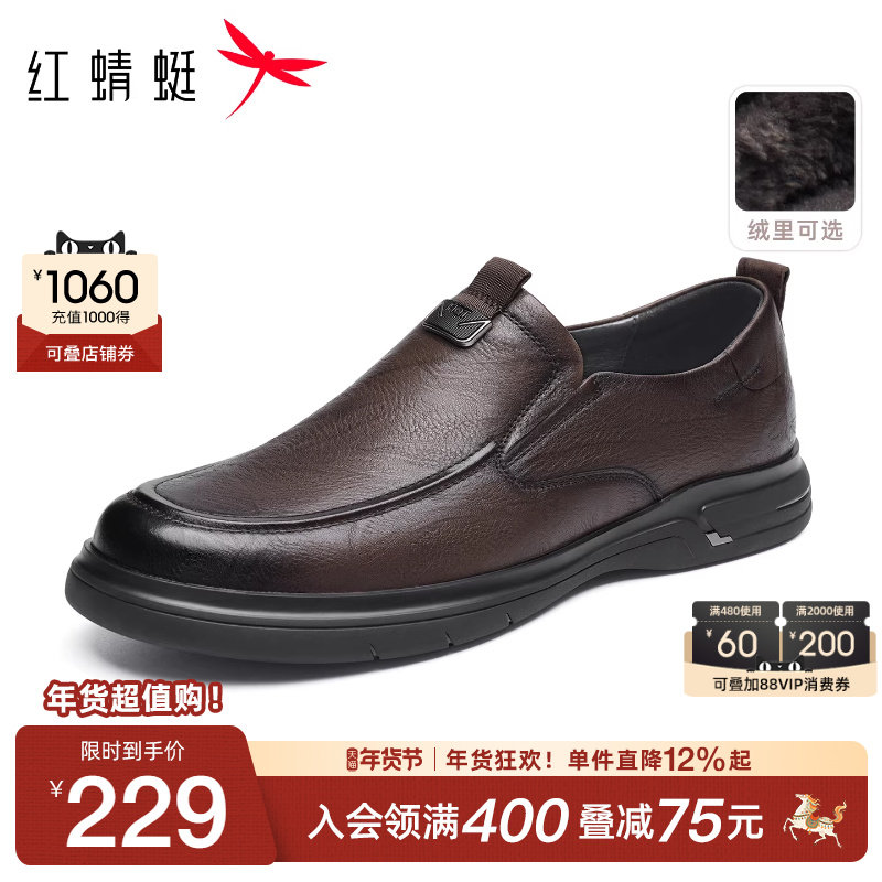 红蜻蜓男鞋真皮中老年休闲商务皮鞋正品高档加绒一脚蹬懒人爸爸鞋