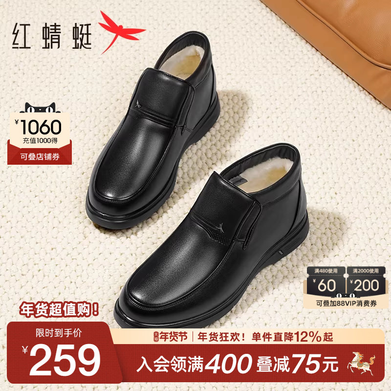 红蜻蜓男鞋冬季新款加绒保暖休闲棉鞋男士真皮中老年爸爸皮鞋男款