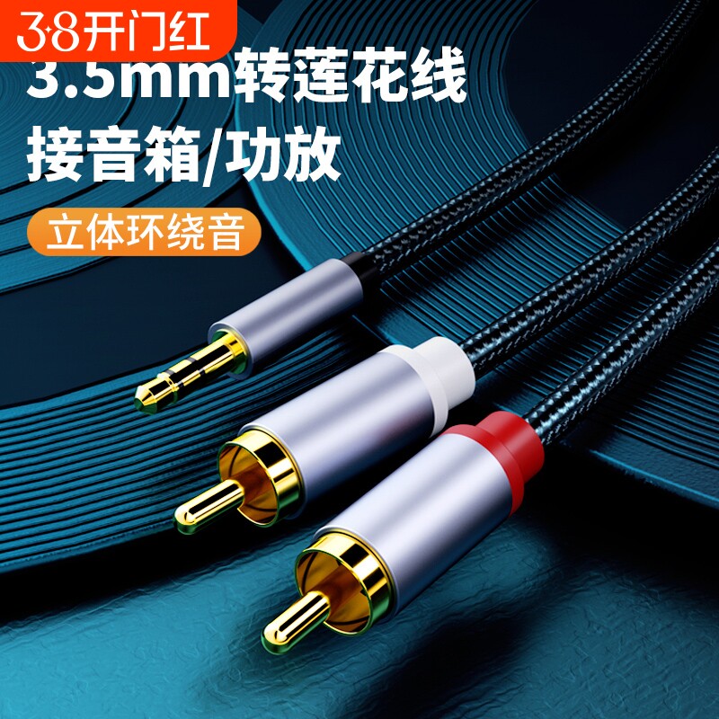 AUX一拖二音频线手机3.5mm转莲花线台式电脑笔记本连接音箱音响功放一分二连接线双头红白2RCA头输出入转换器