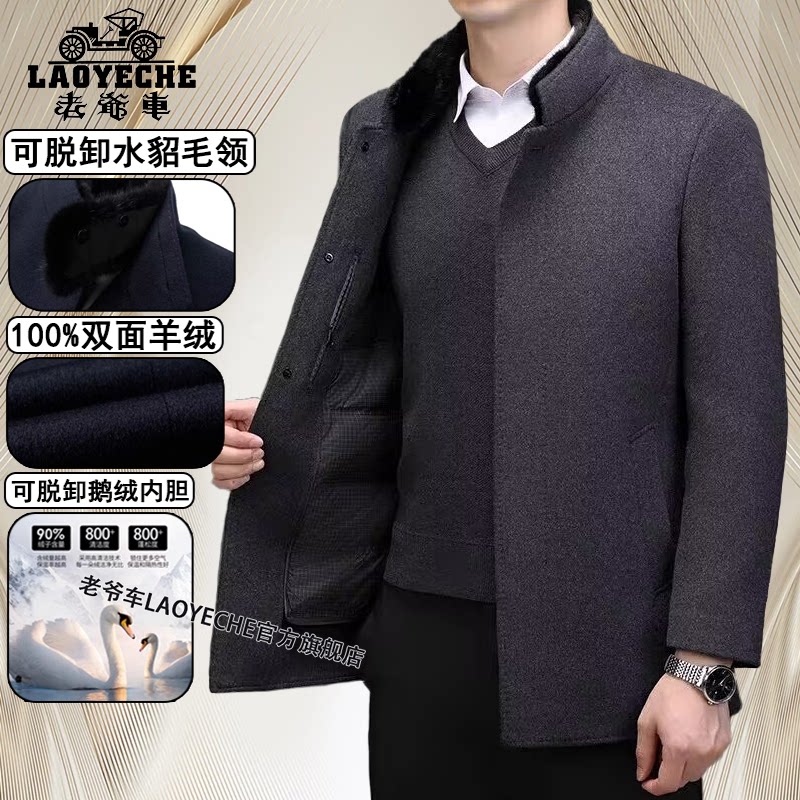 老爷车秋冬季新品可脱卸鹅绒内胆中老年男士貂毛立领双面羊绒大衣