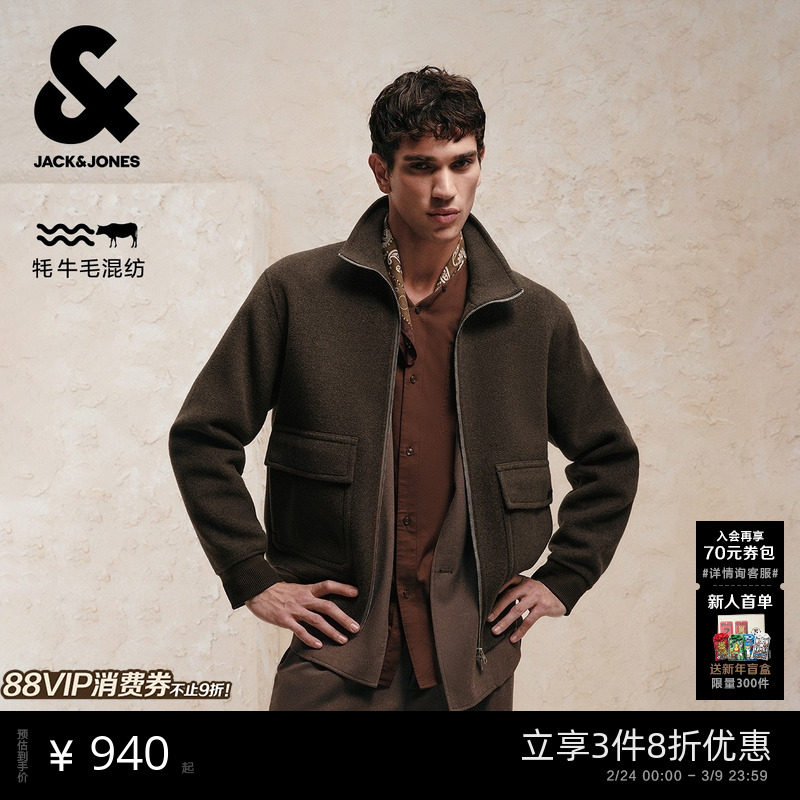 杰克琼斯男装秋冬毛呢大衣2025年新款立领宽松拉链口袋长袖外套