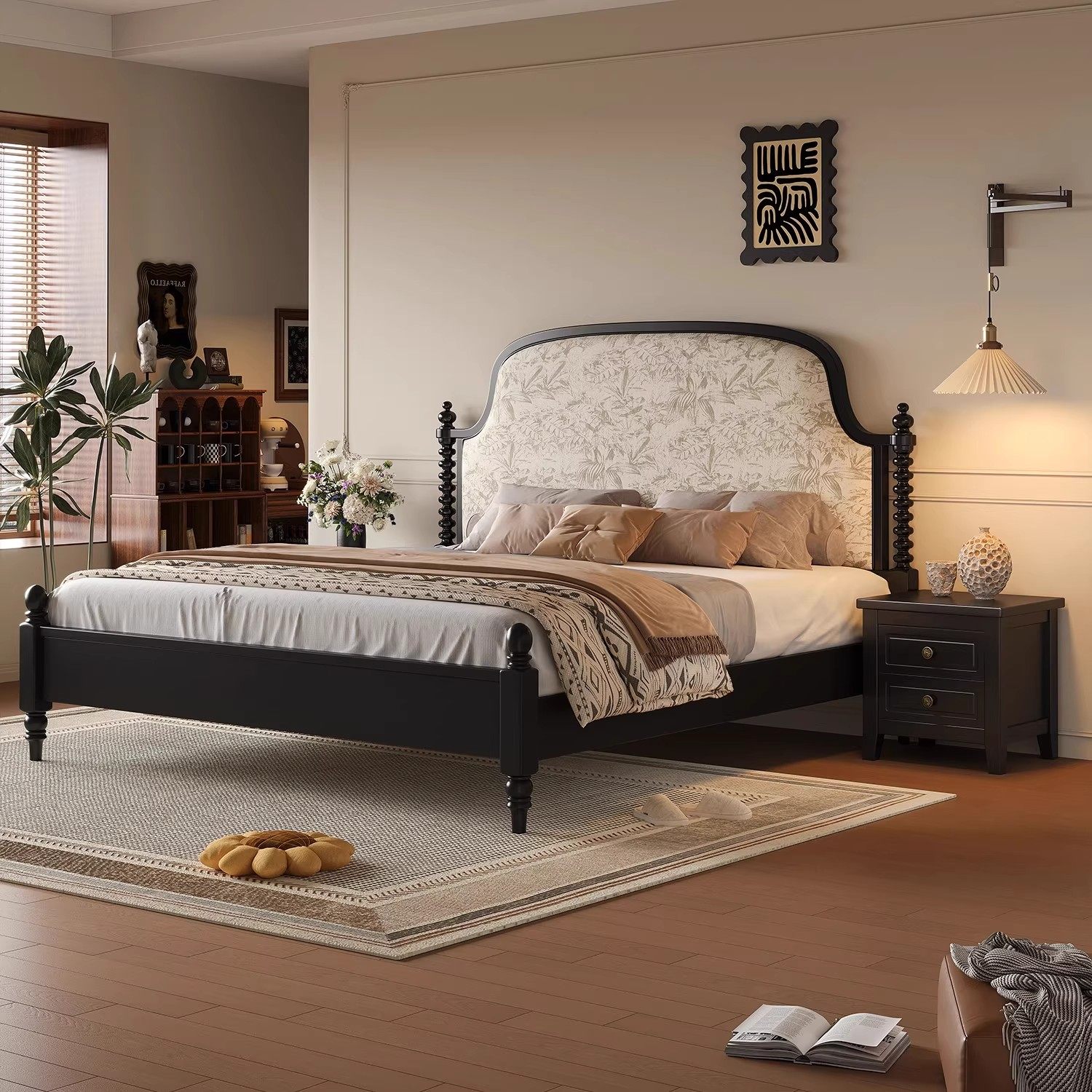 木居盛法式中古实木床美式复古大板床主卧室黑色双人床家用1.8米