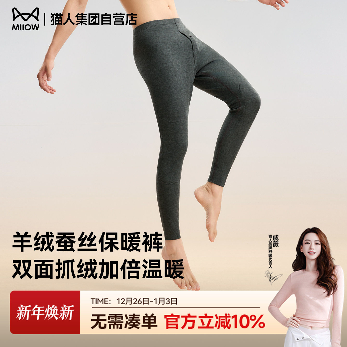 猫人羊绒蚕丝保暖裤2025新款秋冬纯色加绒加厚打底裤护膝贴片秋裤