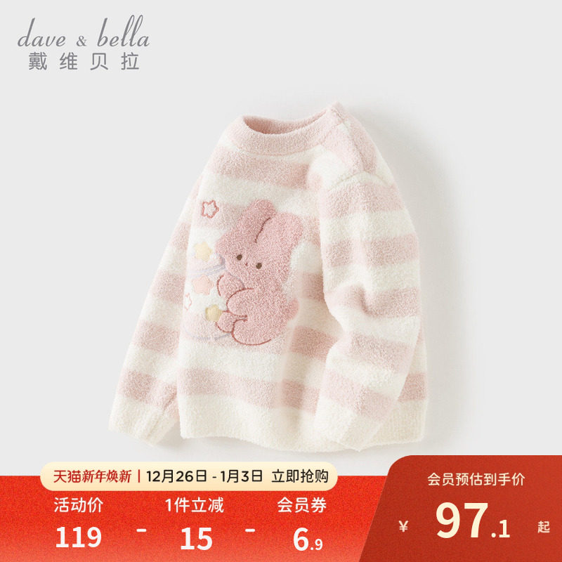 戴维贝拉儿童毛衣套头衫2025冬季新款女童宝宝半边绒条纹上衣A类