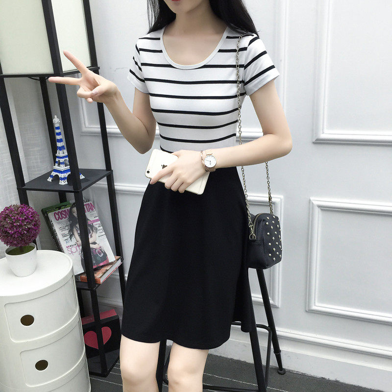 条纹套头女士连衣裙2021新款夏装收腰显瘦 气质中长款短袖a字裙子