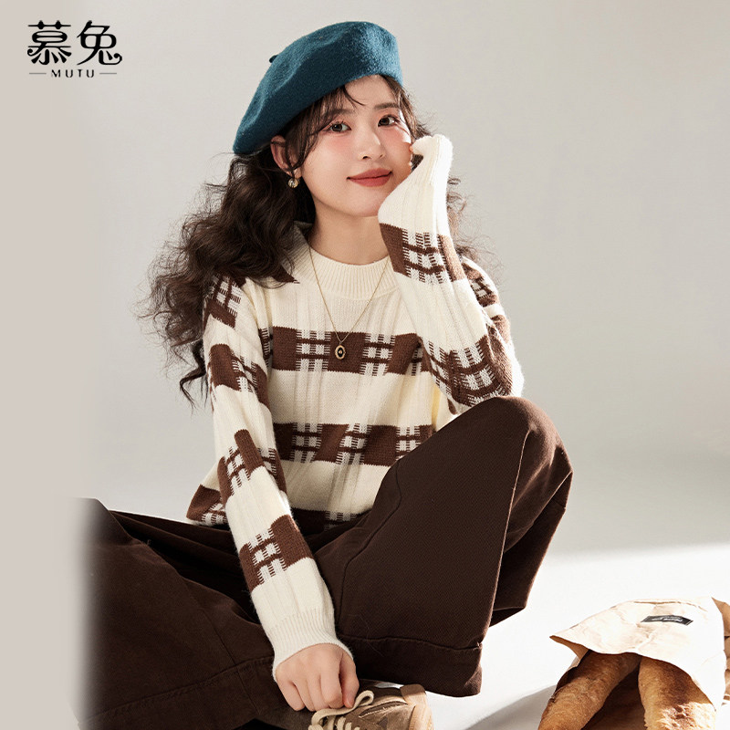 慕兔复古条纹圆领套头毛衣女2025冬季新款慵懒风软糯长袖针织上衣