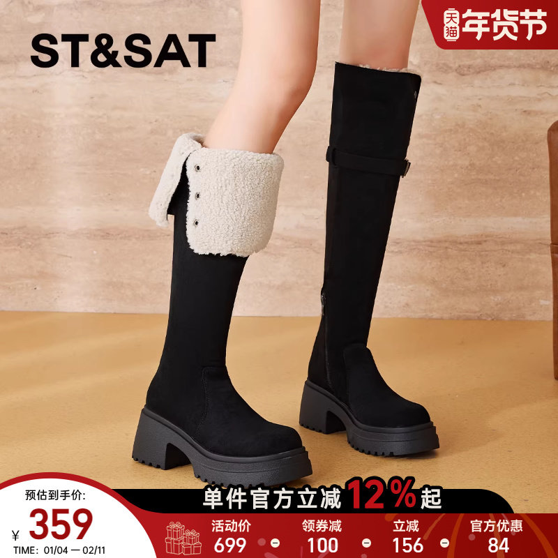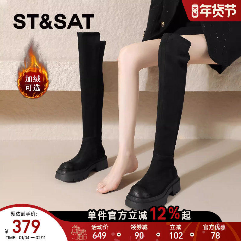 星期六过膝厚底长筒靴女2025新款冬季黑色加绒靴女高筒瘦瘦长靴子