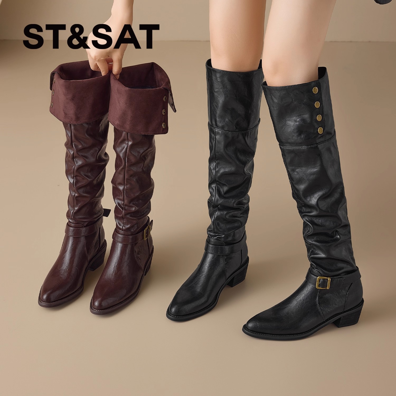 星期六长筒靴女2025冬季新款女靴女款靴子过膝长靴粗跟翻折骑士靴
