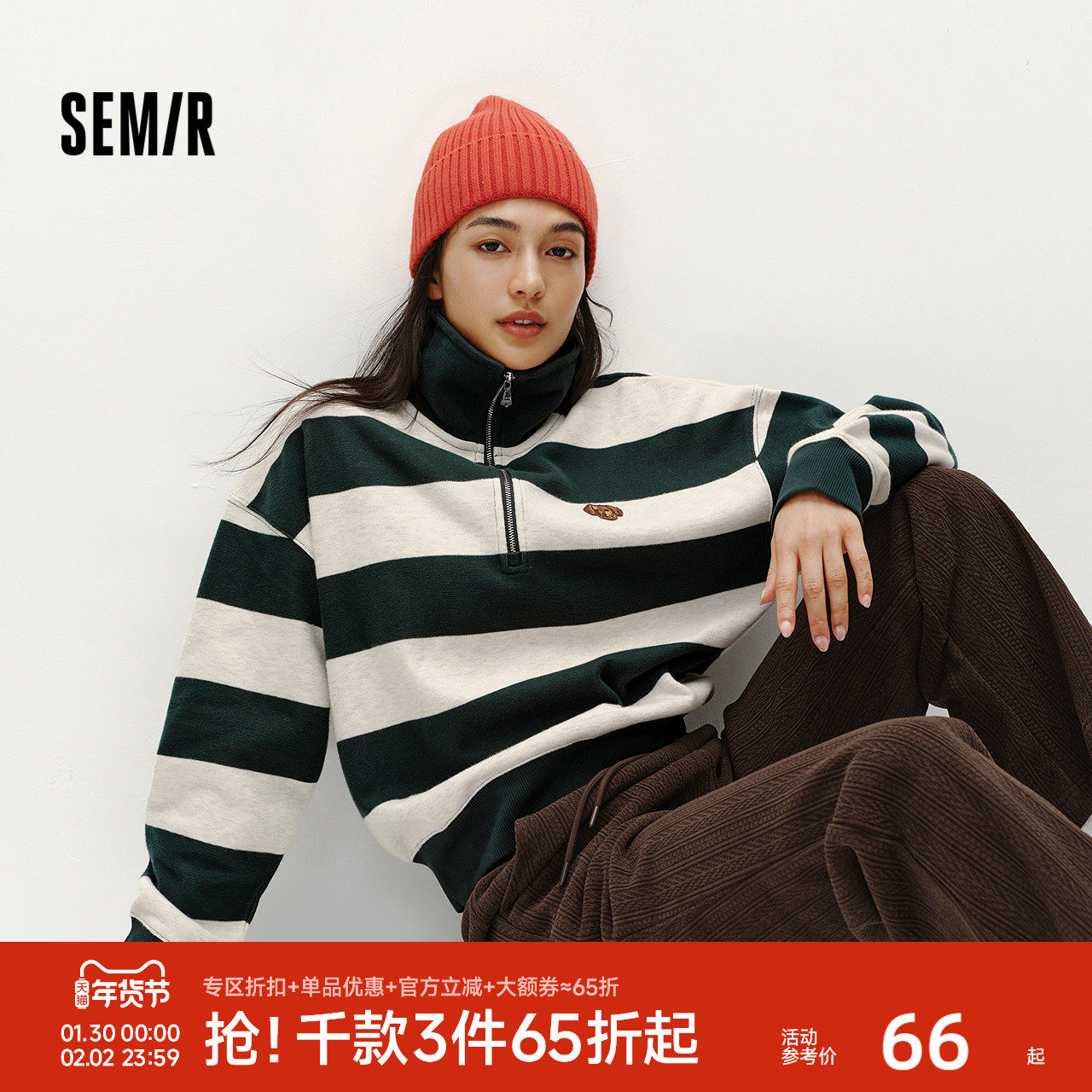 森马卫衣女冬半拉链立领小狗oversize条纹抓绒套头衫叠穿复古上衣