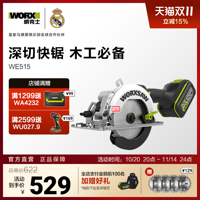威克士锂电圆锯WE515无刷充电式手提锯无线电锯木工锯专用切割机
