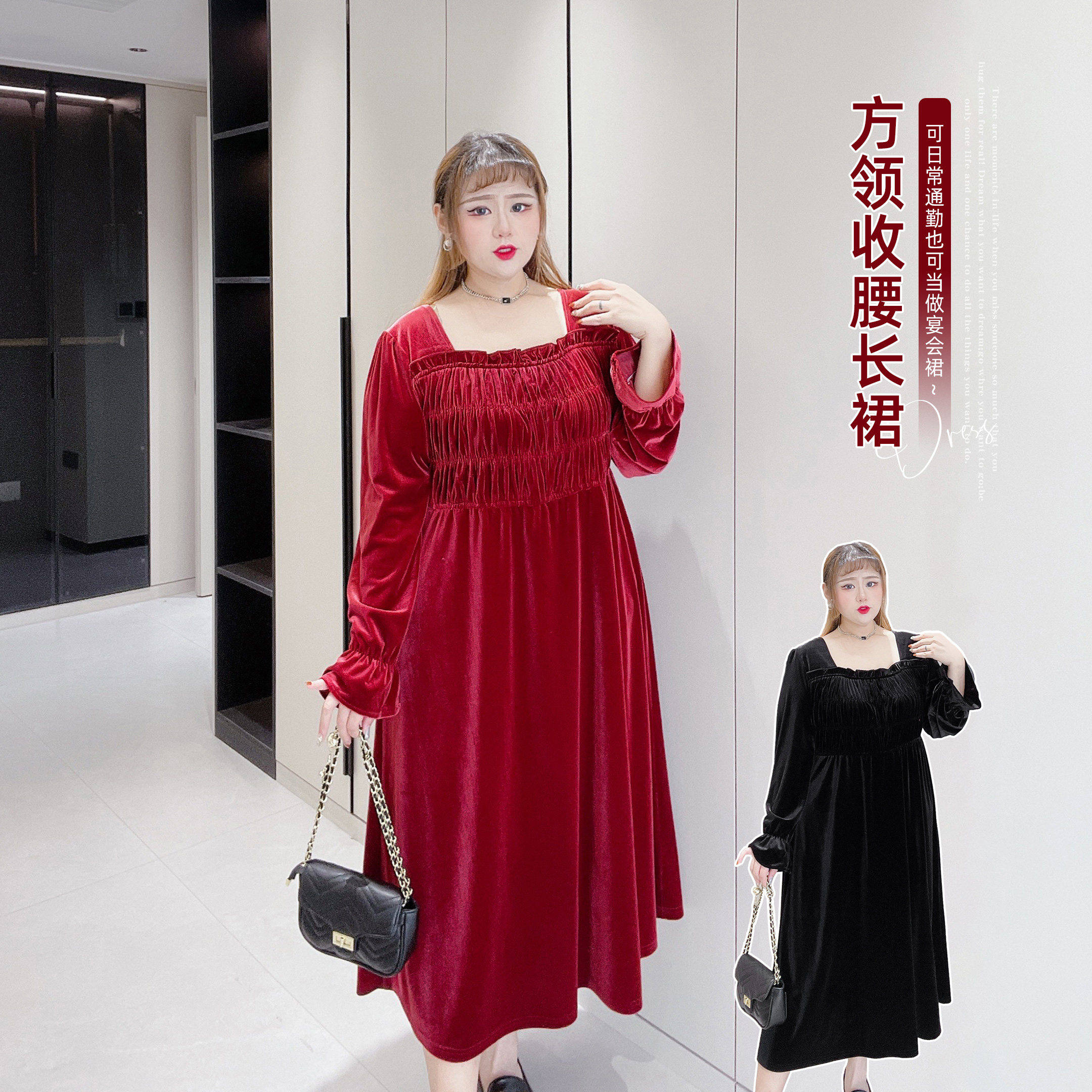 260斤胖妹大码女装复古法式方领丝绒红色年会礼服高级感长连衣裙