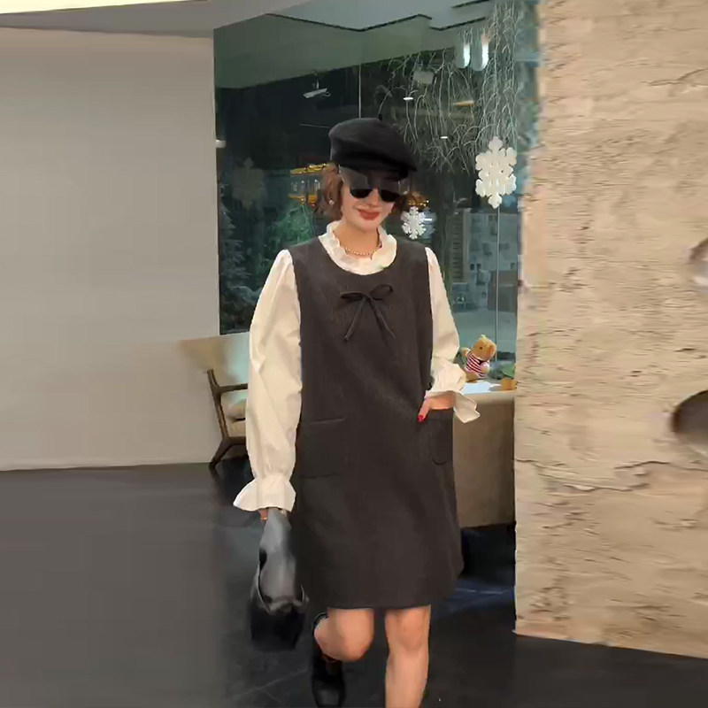 加肥胖妹妹色翻领长袖收腰假两件连衣裙大码女装简约显瘦通勤裙子