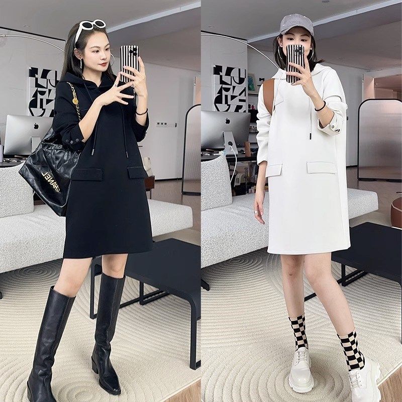 秋冬季加绒加厚卫衣裙女过膝长款胖妹大码宽松遮肉显瘦带帽连衣裙