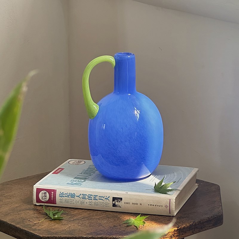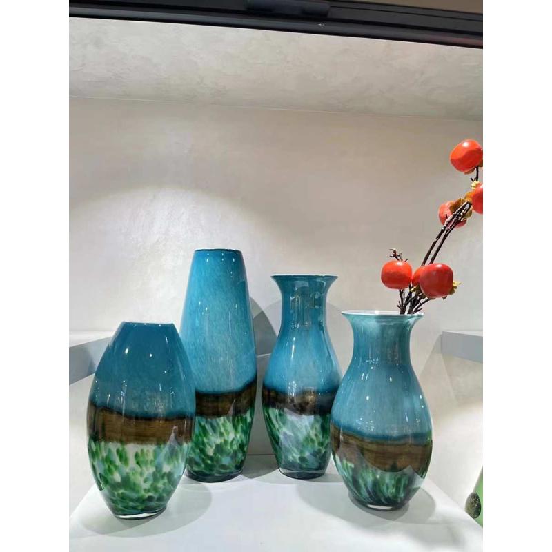 新中式艺术蓝色玻璃花瓶摆件客厅插花琉璃水养手工高级感半然鲜花